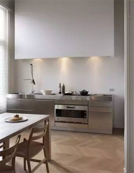 家里装修偏工业风格或者喜欢金属质感的,可以选择不锈钢材质的台面。不锈钢台面号称是最易清理的台面,比如酒店后厨等基本都是不锈钢台面,它不仅耐火耐高温易清洁,而且还抗菌。