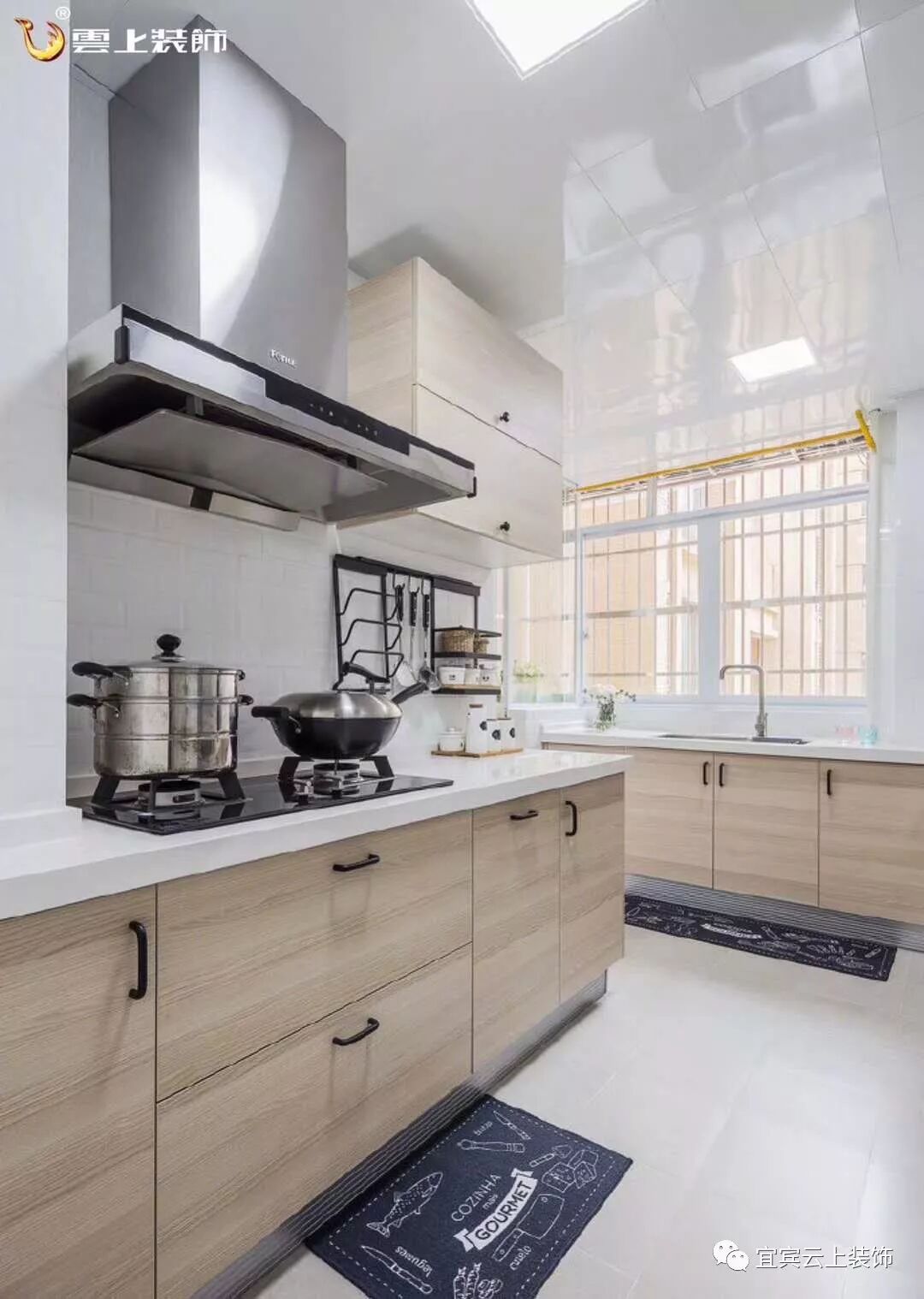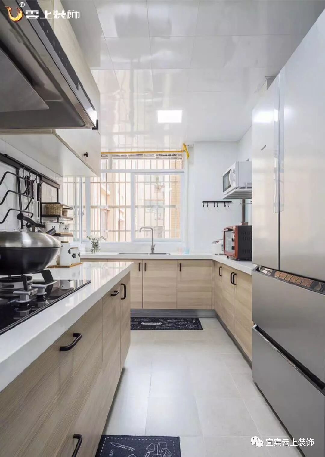 厨房的采光性极好,白色的天花板和墙面都能形成良好的反光效果。白色的台面搭配原木色的柜门可以说是北欧风的特色之一了,自然与简单体现在生活的每一处。
