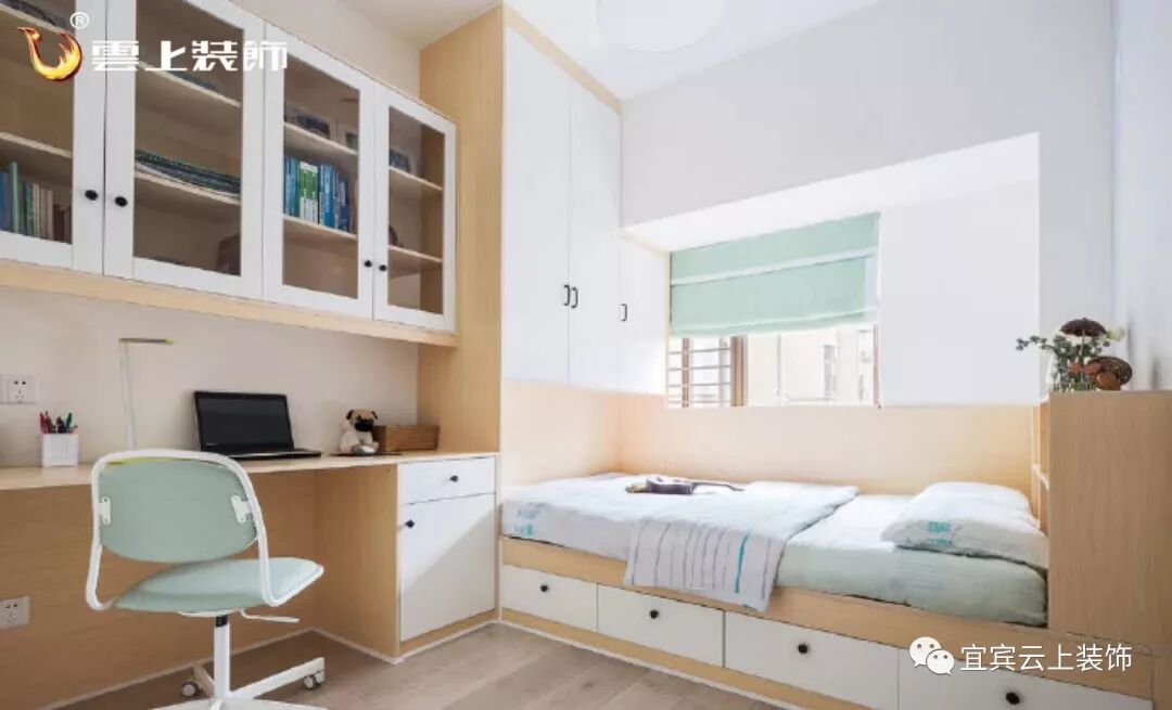 创维的至顶柜连接到横梁下方,腾出了更多空间放置业主的物品,同时在床的下方也做了推拉抽屉,这下再也不用担心东西没有地方放了,书桌上方与侧边也设计了置物柜和抽屉,取用时也很方便。