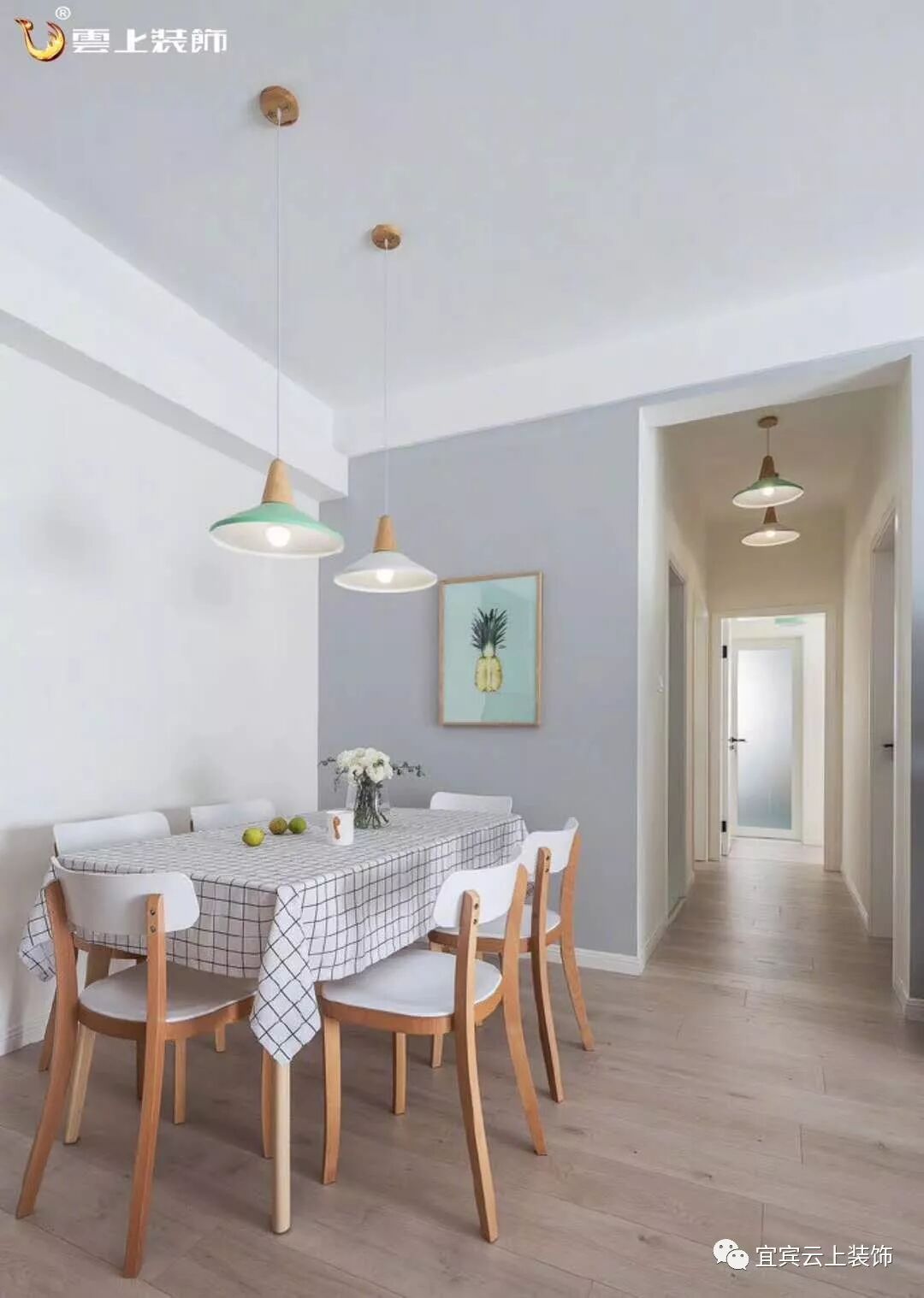 餐厅的设计保留了功能性,顶部采用了聚光性良好的圆锥盘吊灯,白色和原木色拼接的餐桌椅简单而又实用,清新的格子桌布也与四周氛围相合,再摆上一瓶插花,生活不仅只有饱腹还要浪漫兼顾。
