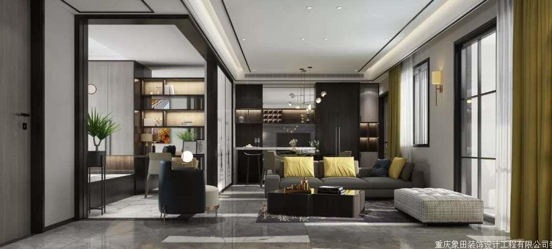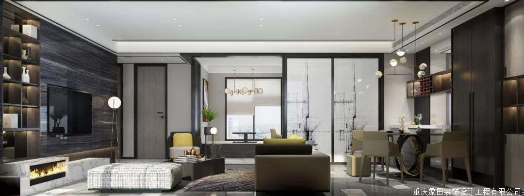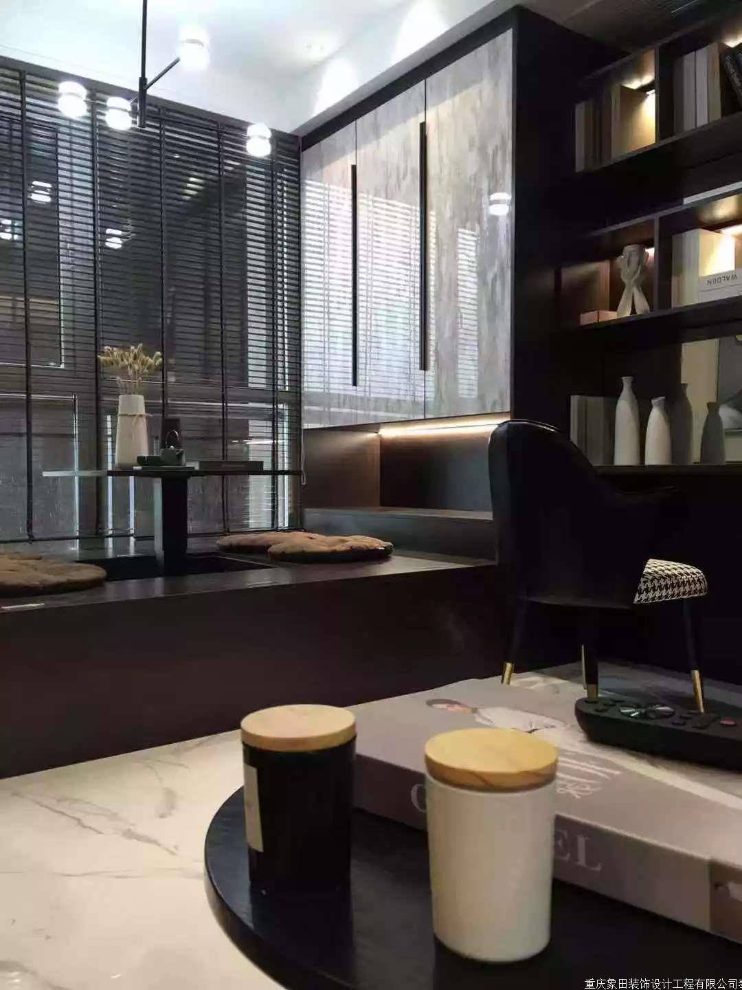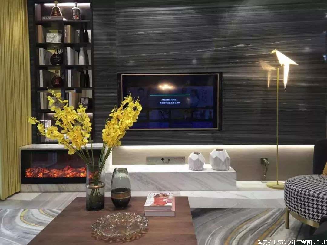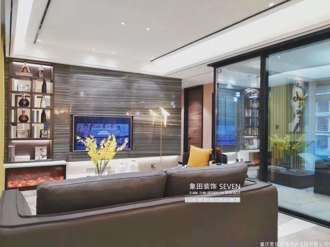 皮质沙发、木质茶几、大理石电视墙、壁炉、书架、窗帘加上点缀灯槽、灯光。置身与一个空间仿佛浑然天成。舍弃传统客厅主灯的观念、以射灯聚光投射茶几来达到居家气氛与生活品质。