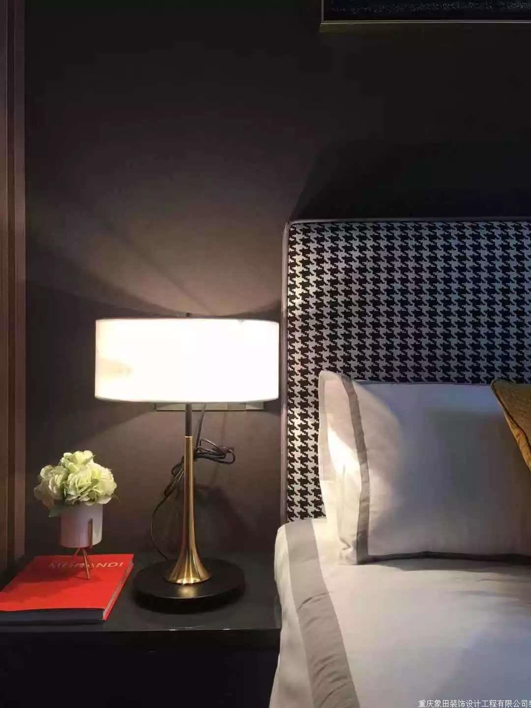 主卧同样也舍弃了主大灯的传统、以灯槽、射灯、床头灯来烘托整个睡眠区域。咖啡色的背景色结合柔和的浅灰。暖光的映射下让房间局部如星光之火,提升着卧室空间的温度、弥漫着蠢蠢欲动的“荷尔蒙”。