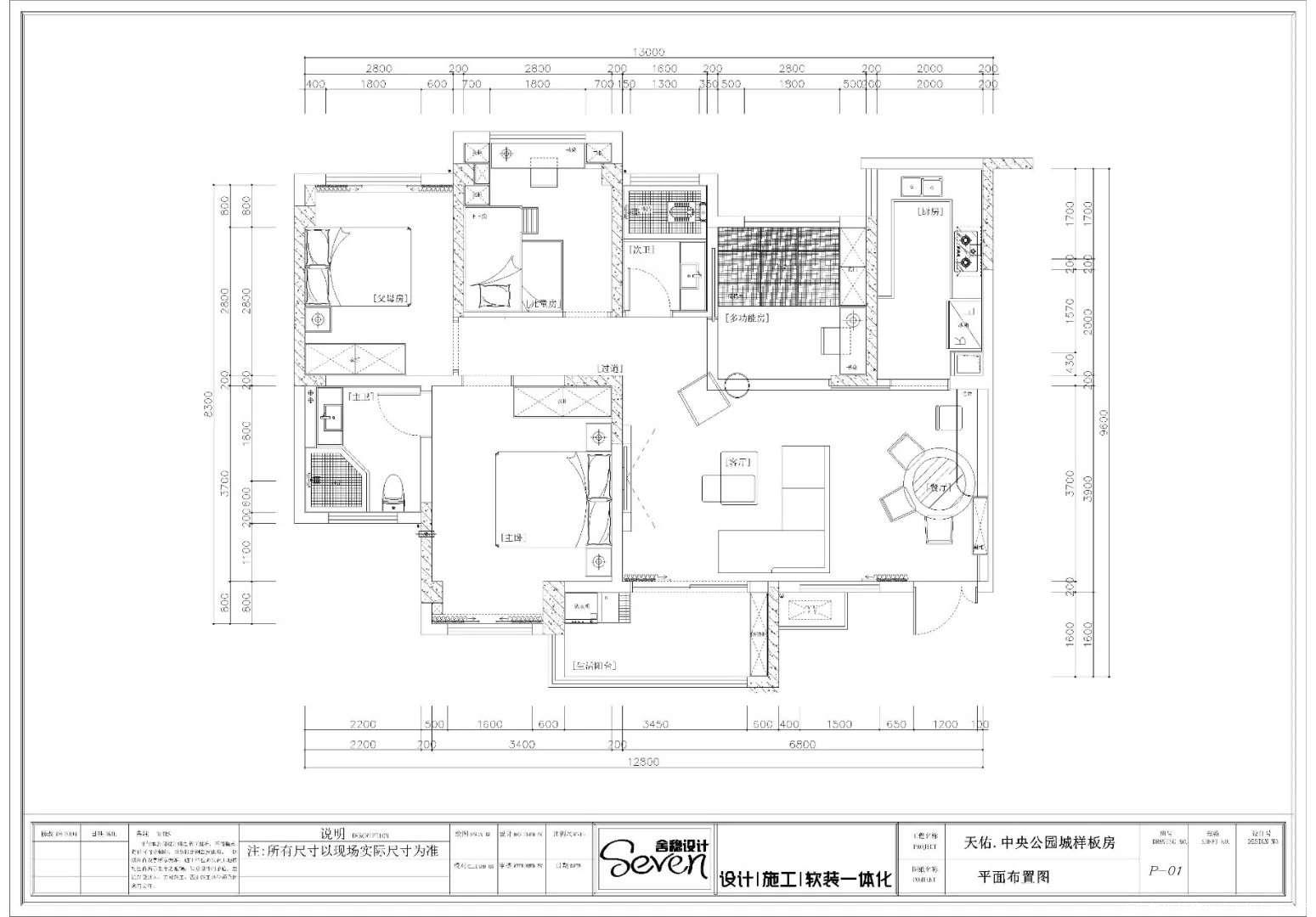 本案户型定位四室两厅两卫。经过仔细研究全屋布局关系、动向路线、风水等、考虑到客厅的空间不足情况、将客厅旁边小卧室改为开放式书房、同时又能满足休息的空间。在拉伸空间同时也解决的了客厅空间的采光不足。书房与客厅采用可移动不透明玻璃门。在空间的延伸后又不失独立性。