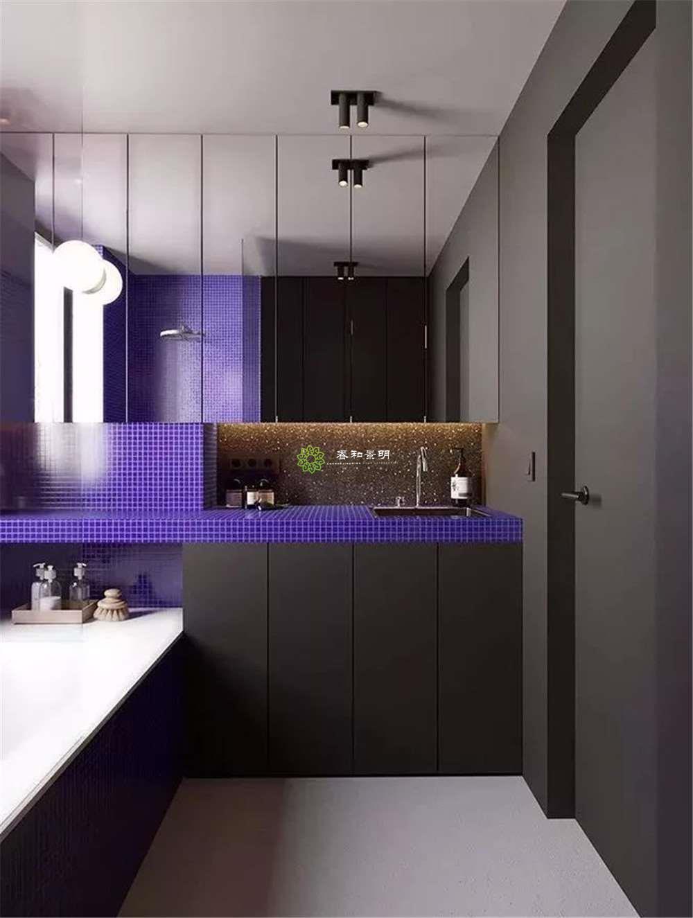 卫生间面积虽小、功用完全,灰色与紫色的搭配适可而止,无形中营造出一丝丝梦境迷人的空间格调。大面积的镜柜简略、实用,又极具扩大空间的作用,轻而易举地缓解了卫浴间的狭隘感。