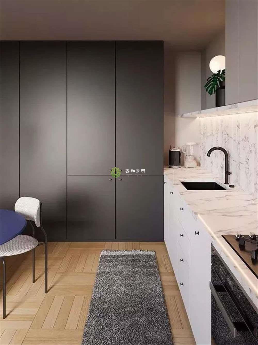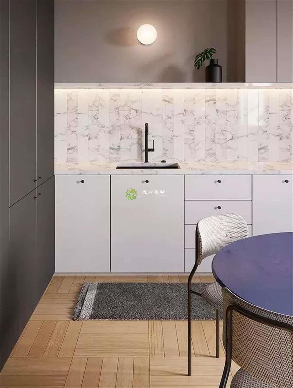 一字型厨房包含了大量储物规划,挡板部分采用竖纹瓷砖装修,与橱柜及地面线条形成了奇妙的呼应,看起来更具层次感。