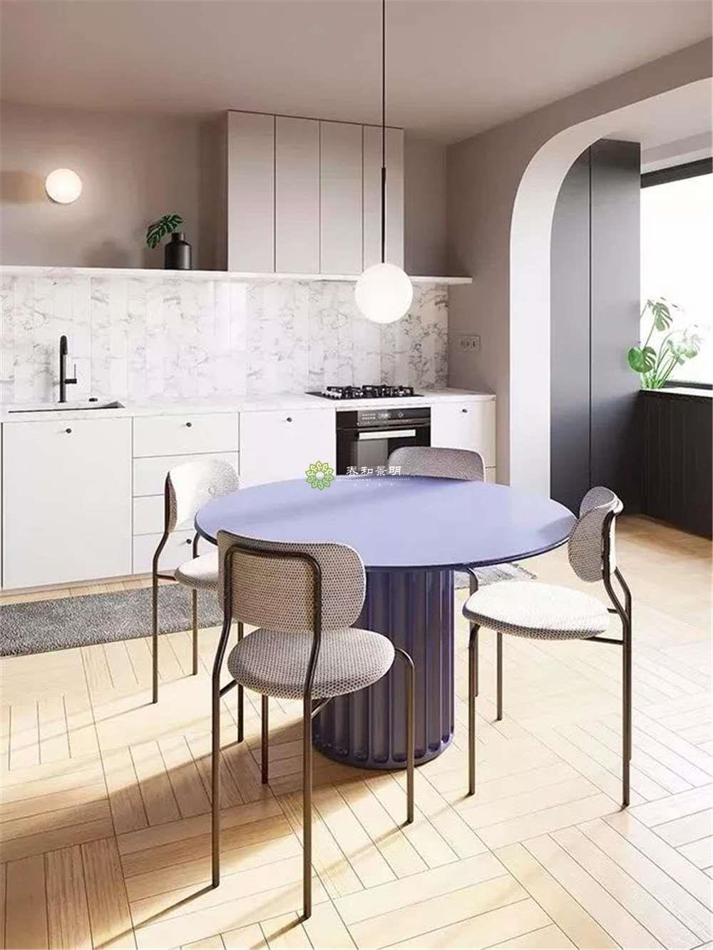 以一张紫色圆桌吸引视野的餐厅,则被安排在开放式厨房的周围。两大功用融为一体,并采用毫无遮挡的开敞式规划,促进了采光和空气流通,也让整体视野得到了延伸。